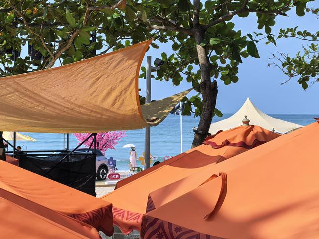 不能下海,人们便安安静静地待在沙滩上。浴巾铺开了,垫子展开了,三三两两,或坐或卧。有情侣并肩躺着,絮絮地说着体己话,女伴偶尔侧过身,往男伴背上轻轻抹一层防晒油,手指划过皮肤,像春风拂过湖面,细细的,软软的。有一家子来的,大人闭着眼,像两枚晒暖的贝壳,孩子蹲在一旁挖沙,挖出一个坑,又填上,填上了又挖,忙得不亦乐乎,仿佛那是世上最要紧的事。也有独坐的,望着海出神,目光悠悠地飘出去,落在远远的天际线上,不知在想什么;或者翻几页书,读到会心处,嘴角微微一弯,像尝到了一颗甜果子。