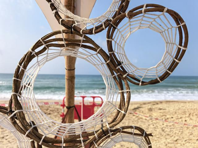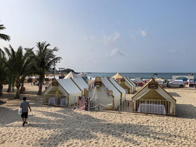 沙滩上却有些异样。平日里散落的遮阳伞不见了,一顶顶白色帐篷沿着月牙岸线齐齐排开,像一群刚歇下的白鸥敛着翅,又像一夜之间沙滩上长出了一片白蘑菇,露水还没干透。帆布是新浆洗过的,在上午的阳光下泛着柔和的、毛茸茸的光。是给“新朋友营地”和音乐节准备的,我猜到了夜里,这些小帐篷里该亮起一盏一盏的灯,从沙滩这一头亮到那一头,像地上的银河,漾漾地晃着。