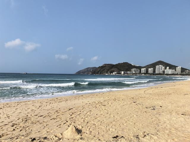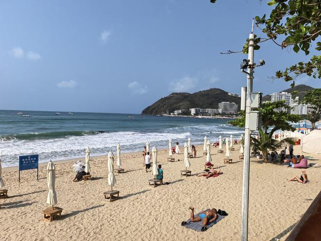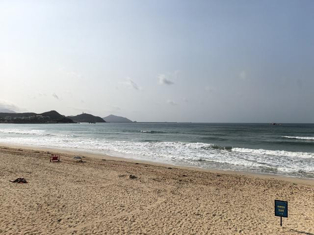 这海湾藏在榆林港与鹿回头之间,三面环山,一面朝海,弯弯的一弧,像大地微微张开的臂弯,又像天上月落在这南国海滨,化成了一泓碧水。二点九公里的岸线,不长不短,恰好兜住了一湾温柔。当地人说起它,总要带一句“水暖沙白滩平”,六个字,把一片海的脾气说得清清楚楚。