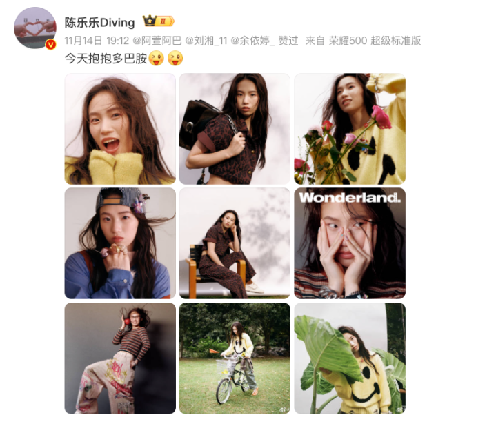 11月14日晚,陈芋汐在社交平台发文晒图:今天抱抱多巴胺。