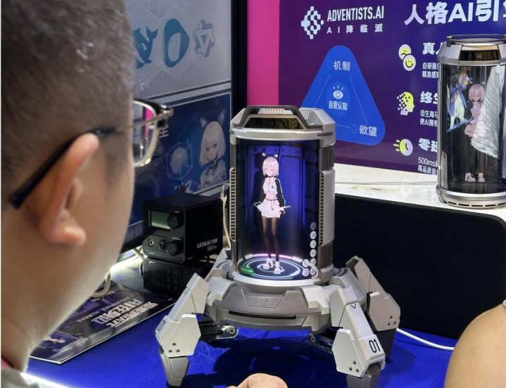 比如在数伴科技的展台,我们体验到了一款AI陪伴类硬件产品,这款产品能够实现视角追踪、定制角色、语音对话、触摸交互等功能,并以AI驱动二次元小姐姐在虚拟空间中完成打招呼、舞蹈等动作。