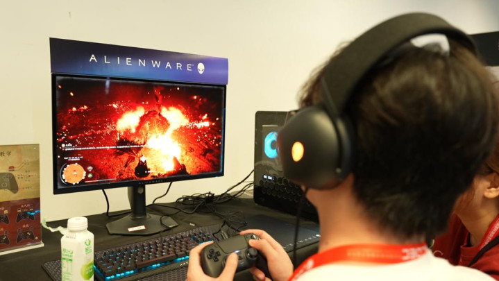 《明末:渊虚之羽》设置了试玩体验区,现场配备了30台电脑,整体占地面积还是挺大的。但是灵泽貌团队并没有深度参与这次展会,现场除了挂出开发商灵泽科技和发行商505Games的logo以外,还出现了服务运营商百家合以及游戏催化局的logo(国内发行商B站的名字并未出现)。