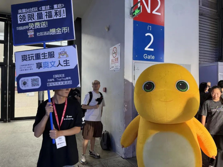 另一方面,场间整活的也有不少。展会第二天,举着《星球:重启》试玩牌子的工作人员在N2馆内来回晃悠宣传,而他背后始终带着一只奶龙。