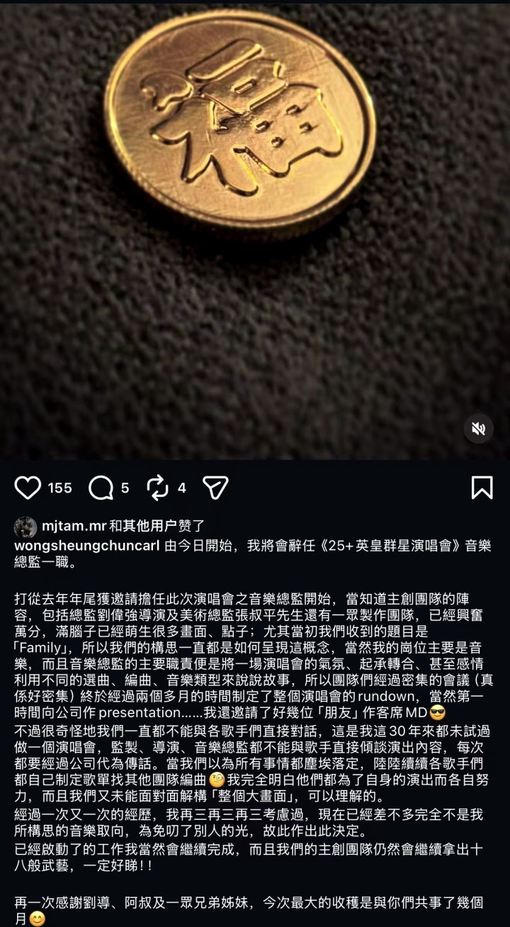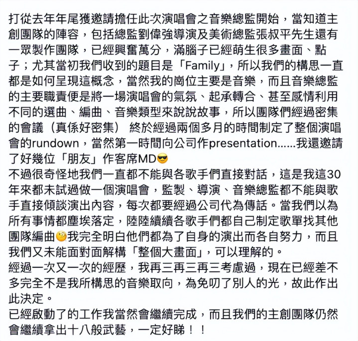 从王双骏的长文内容推测,他并非放手不管,而是不愿意承认《25+英皇群星演唱会》是他的作品。