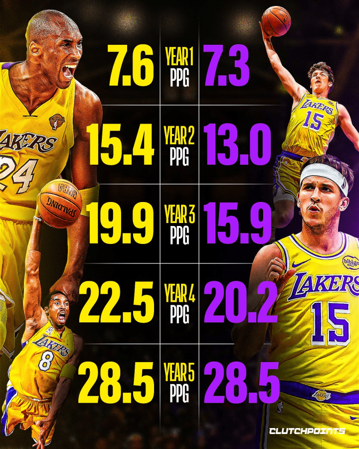 虎扑12月02日讯今日,美媒ClutchPoints晒出了奥斯汀-里夫斯与科比-布莱恩特相似的前五年数据对比并配文: